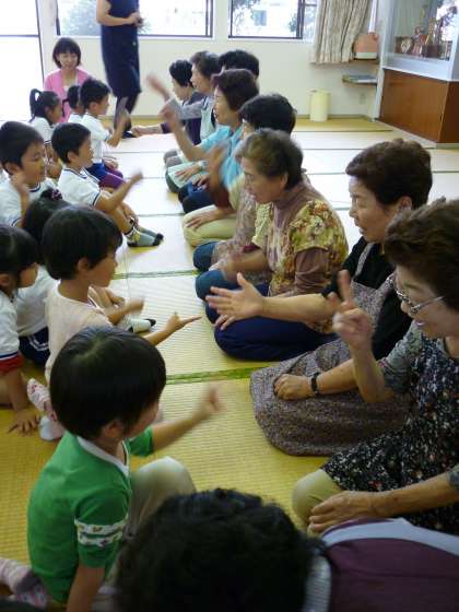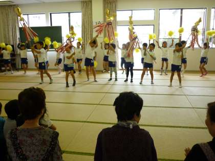 幼稚園近くの高内会館で年長組が「おまつりワッショイ」や「富山の歌」を地域の祖父母の方に披露しました。最後に祖父母の方とじゃんけんゲームをし、触れ合い遊びを楽しみました。初めは緊張していた子ども達でしたが、じゃんけんゲームで緊張がほぐれたようでした。