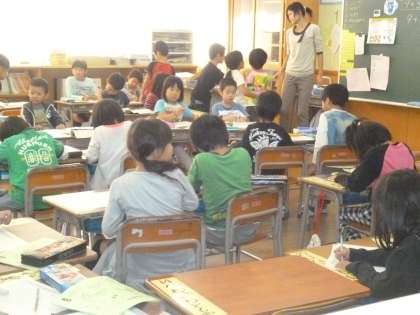 一年生のクラスでは、先生のお話をしっかり聞いている先輩たちがいました。