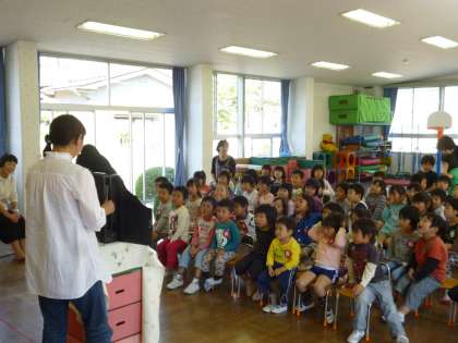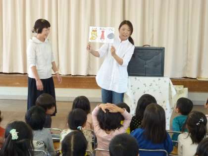 富山市立図書館よみきかせの会の方に、紙芝居や大型絵本などを読んでもらいました。コンちゃんしりとりクイズをして遊んだ後、クラスに戻って、しりとりをして遊びました。「ねずみのいもほり」の話を見ると、先日のたくさん掘った芋ほりのことを思い出し、大きな芋が掘れたことや大きなミミズがいたことなど話していました。