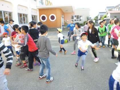 今日は第2回目の交流会。お天気もいいので小学校のグランドや幼稚園の庭を使ってのハンターごっこ。