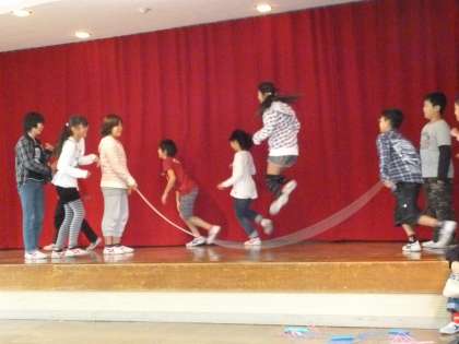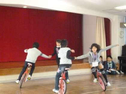 5年生に、フープや縄跳び、一輪車などを見せてもらいました。その後、パートナーさんと一緒に一人ひとりに応じた遊びをじっくり教えてもらいました。