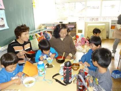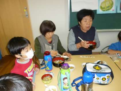 おいしいね。おいしいね。お孫さんと一緒に食べるさつま汁は、より暖かかったことでしょう。