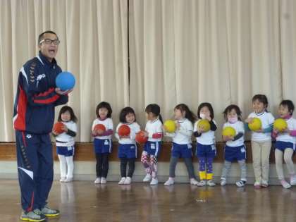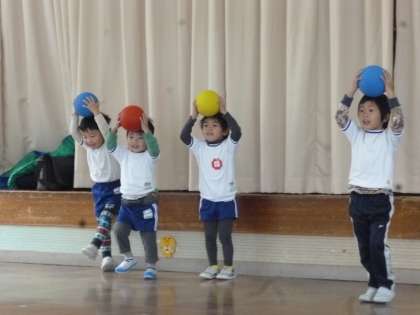 今日は、今年最後の体操教室。「これは、卵だよ。落とさないようにね」と、ボールを片手で持ったり、背中におんぶしたりなどして移動する運動をしました。