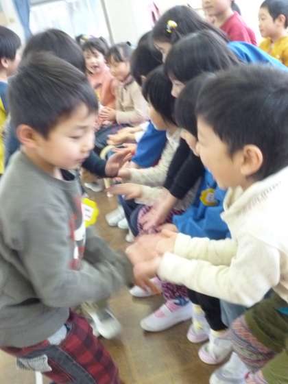 いつの間にかお誕生会は、みんなに「ハイ、タッチ」をして入場するのが定番になったようです。