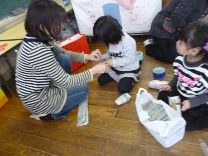 新聞紙を丸めて作る安全なぽっくりをお母さんがつくって、子どもたちと遊んでくださいました。