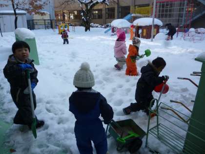 晴天の空の下。雪でいっぱい遊んだお友達。