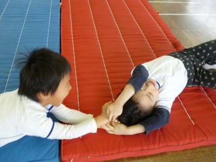 マットの上を友達と手をつなぎ転がっていく運動。簡単なようで、気が合わないと曲がってマットの上からはみ出してしまいます。二人の笑顔が最高です。「友達っていいな」そんな声が聞こえてきそうです。