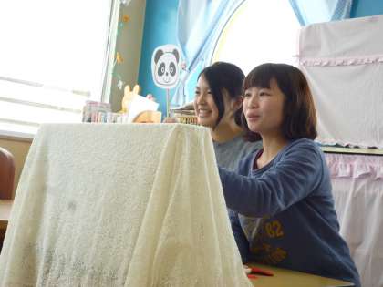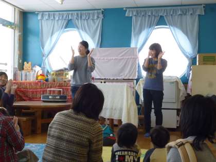 今日の絵本サークルはかわいい実習生のお姉さんたちが担当。手遊びやペーぷさーとなど大学で学んできたことを披露してくれました。