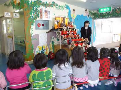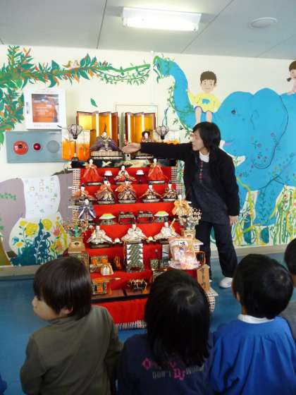 「この一番上におられるのがお内裏様」「これは五人囃子っていってね・・・」という説明を真剣に聞いている3歳児さんでした。
