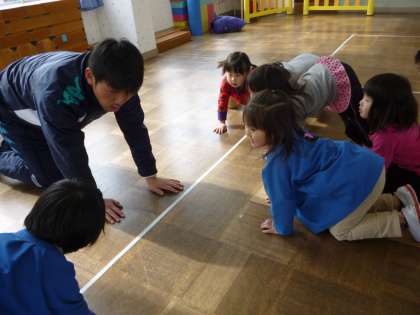今月から3歳児さんが、ワイワイタイムに参加しました。「トイレに行く時は、ペンギン(かかとで歩く)になって行こう」「お風呂に行く時はキリン(つま先で歩く)になって行こう」など、基本的な動きについて楽しく教えてもらいました。
