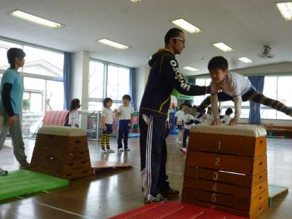 今日は跳び箱。5歳児さんは「先生、手を持たないで。自分でするから」と、もう自信満々です。体操の中でも、恐怖心のないこの時期に器械体操に挑戦することは、とてもいいことのように思います。