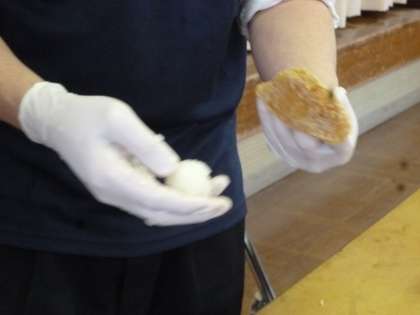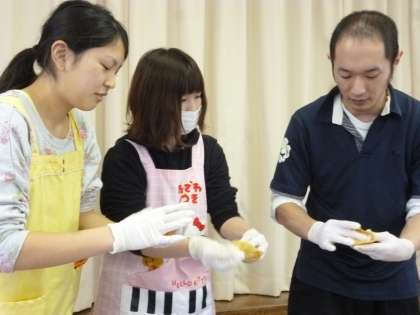実習のお姉さん先生たちもいなりずし作りに挑戦。「これで、家でも作れます」と嬉しそうでした。
