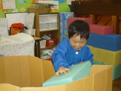 お部屋にある段ボールがいつの間にか、おうちや滑り台に変身。お友達ともかかわって遊ぶ姿も見られるようになりました。
