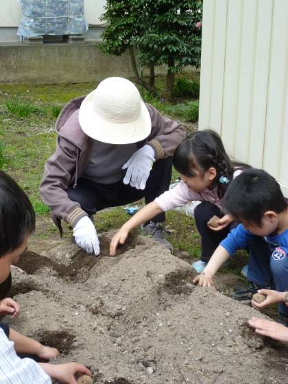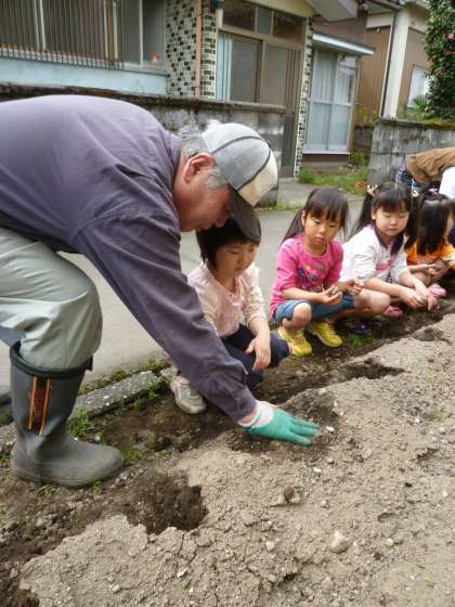 子ども達のおじいちゃんやおばあちゃんに来ていただいて一緒にたねいも植えをしました。ありがとうございました。