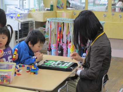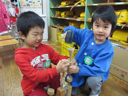 4歳児さんは、「ねえ、ここ持って」「いいよ」と協力しながら、木槌をもっていろんなものを作って遊んでいます。