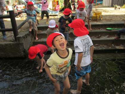 さっそく素足になって入った子ども達「へー冷たい」の声に、次々に子ども達が集まってきました。楽しい楽しいひと時でした。