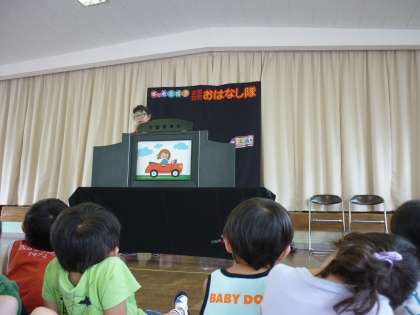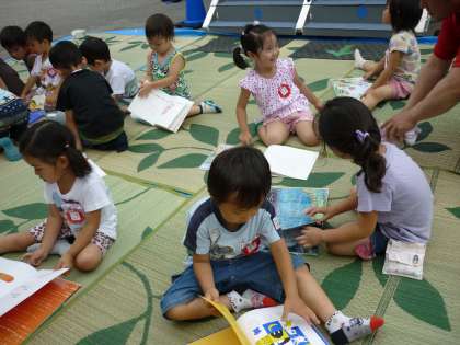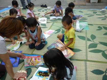 子どもたちはいろいろなお話を聞かせてもらったり、好きな絵本を選んできて、園庭のござの所でじっくり絵本を見たりしました。