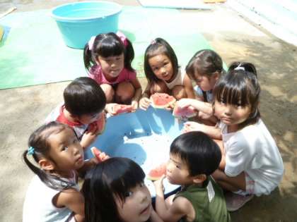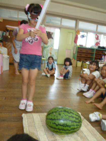 預かり保育に来ているAちゃんのお家から大きなスイカをいただきました。今日来ていたお友達と一緒にスイカ割りをしてから、食べることになりました。周りにいるお友達が「もっと前」「もう少し右だよ」と上手に教えてくれて、ほとんどの人は一回でスイカに当てることができました。その後、皆でおいしくいただきました。ごちそうさまでした。