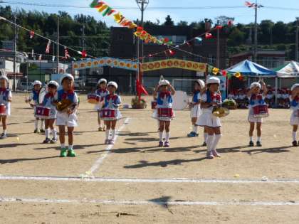 オープニングは、年長児による鼓隊。真っ白な衣装に真っ赤な大きな蝶ネクタイが、名探偵コナンそのものでした。