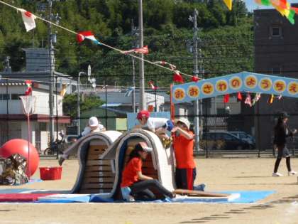 全園児で挑戦した加技走。小学校のお兄さん達が使っている大きな跳び箱は子ども達からのリクエスト。頑張ってよじ登りました。