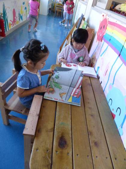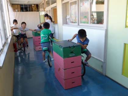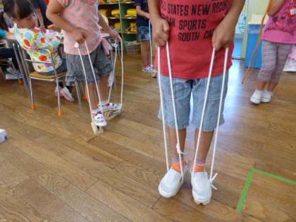 頑張った運動会を終えた子ども達。じっくり絵本を読んだり、一輪車に挑戦したり、運動会でいただいたぽっくりに挑戦したりと、のびのび遊びました。