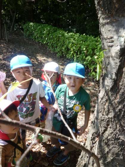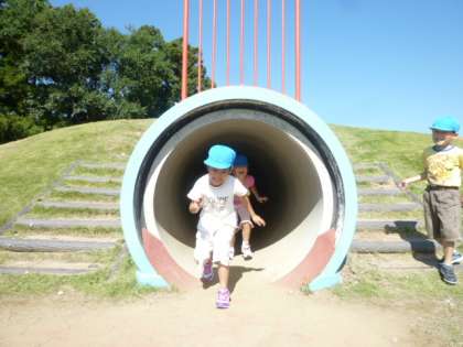 楽しい大きな楽しい遊具で遊んだりトンネルで鬼ごっこをした後は、広場を散策しました。栗を見つけたり、大きなカマキリを見つけて「かっこいい」と顔やカマや動きを観察したりしていました。青空に浮かぶ何本もの飛行機雲に興味深々で、気持ちのよい遠足日和でした。