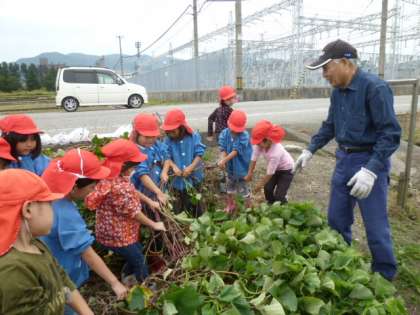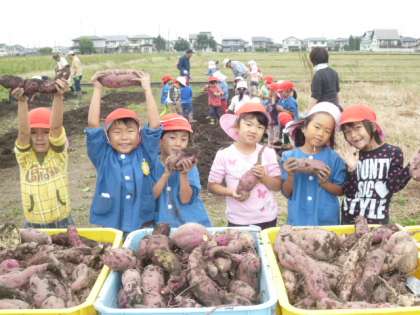 春に植えたサツマイモを、民生委員のおじいちゃん達と一緒に掘りました。お家に持って帰ったり、幼稚園でふかして食べたりしました。11月には野菜や肉も入れて、サツマイモ汁を作って食べたいと計画中です。
