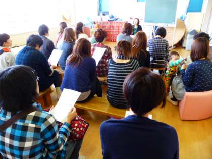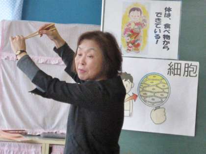 小学校の栄養士の先生に来ていただき、給食の必要性や食習慣の大切さ、正しいお箸の持ち方の教え方など、わかりやすく教えていただきました。