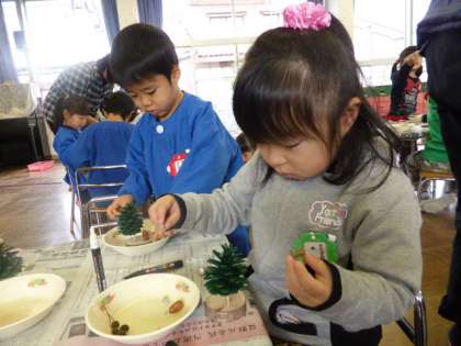 今年度は、立山少年自然の家の企画に便乗し、3歳児と4歳児は松ぼっくりのツリー作り、5歳児はリース作りを体験しました。