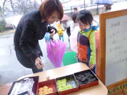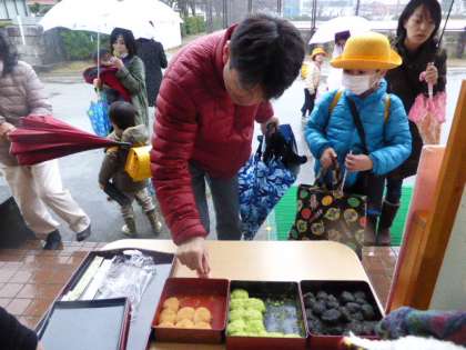 お帰りの時間、お迎えのパパやママたちにもおいしいおもちを食べていただきました。