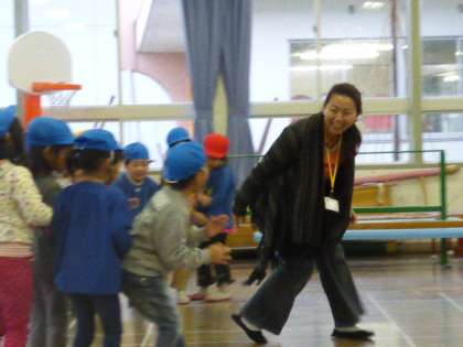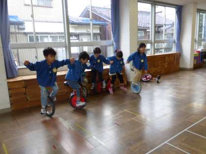 5歳児さんは目下一輪車に夢中。花いちもんめを歌いながら一輪車に乗っています。もう少しで全員が手をつなげるようになるでしょう。頑張れ!!!
