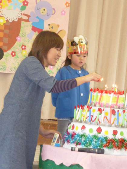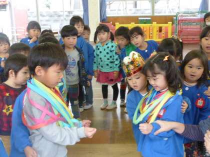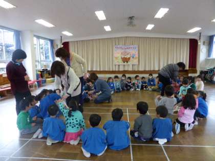 その後は、みんなで「負けるが勝ち。ジャンケン列車」のゲームをしました。「先生、ほんとうに大きな○になったね」「みんなで食べたおせんべいおいしかったね」と、全園児で集う楽しさを味った3歳児さんたちでした。