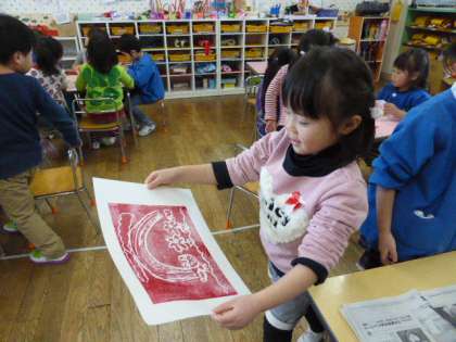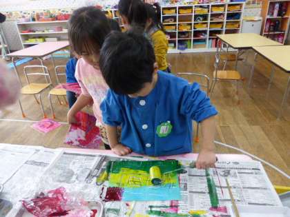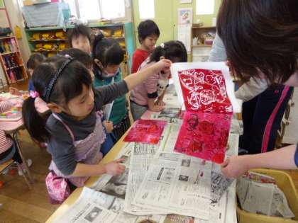 子ども達が版画遊びに取り組みました。「ハンガ知ってるよ。お洋服かけるものでしょ」と。これには担任も笑ってしまいました。でも経験して「わかった。これが版画なんだね」と何度も試しておもしろそうでした。