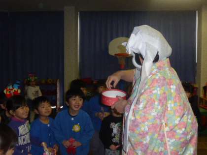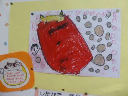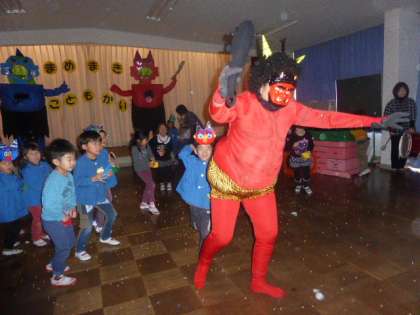 真っ赤な怖い鬼がやってきました。泣き出す子もいましたが、みんなで鬼を追い出すと其のあと、優しい福の神がやってきました。子ども達の顔も笑顔になりました。