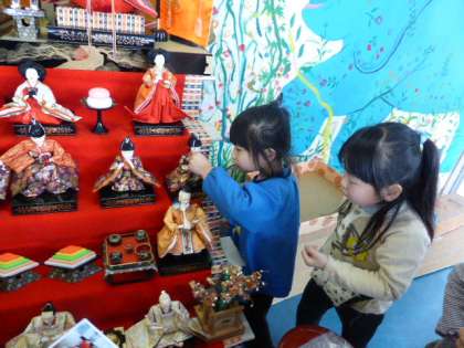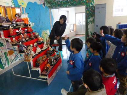 また、女の子達が玄関先にお雛様を飾ってくれました。お雛さま飾りの説明を聞いていた年少組さん。「これ何だと思う?」という先生の言葉に「カメラ!」「えっ?」でも子どもの視線に立って見ると確かに三人官女が持っている三方はカメラに見えました。「なるほどね・・・」