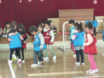 遊戯室の中を所狭しと走りこんでいた子ども達。4月からは広いグランドで思いっきり楽しみたいと思っています。