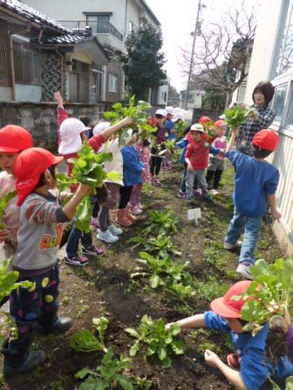 年中さんが育てた大根とかぶ。なかなか大きくならなかったのですが、それでも子ども達は大興奮。「大きい!!」「これチビ」「僕の変な形してるよ」「私の食べられてる」などなど。