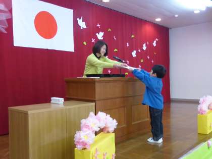 先日の5歳児さんの立派な姿を見ていた子ども達は、真剣な表情で修了の証書をもらい、嬉しそうに文面を読んでいました。