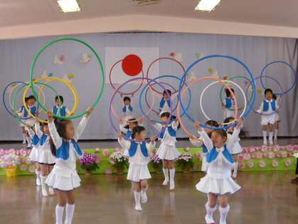 絵本サークルで、時々遊びにきてくれていたお友達もいて、すぐにままごとをして遊ぶ子、ちょっぴり不安でお母さんにしがみついている子などにぎやかにスタートしました。 歓迎会では、年長組さんが元気なダンスと歌を見せてくれました。
