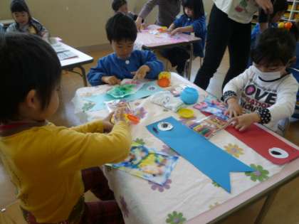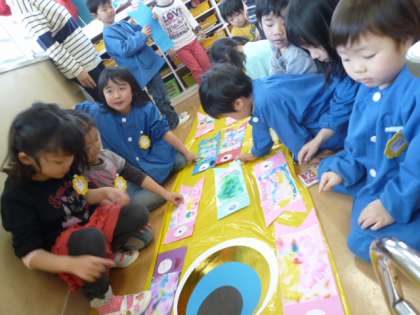 にじみ絵で模様を作ったらとてもきれいな色になって、子供たちも「きれいだね」「すてきだね」と言いながら嬉しそうでした。