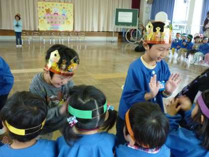 今年度に入って初めての誕生会がありました。お友達とハイタッチしながら、4月生まれさんが笑顔で入場しました。「拍手をプレゼント」という歌を歌ったり、「誕生月のお友達」というフォークダンスをしたりして、みんなで楽しくお祝いしました。お家の人からの手紙や、友達からプレゼントをもらって、とっても嬉しそうな4月生まれさんでした。