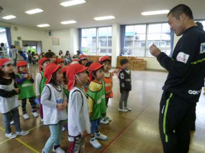 初めてのサッカー教室は、雨のため遊戯室で行われました。