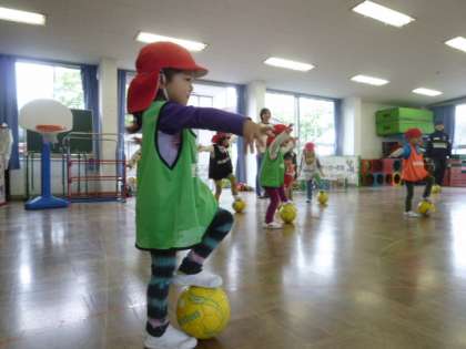 子供たちは、ボールを足で止めたり、ドリブルしながら走ったりするサッカーの基礎をコーチに教えてもらいました。
