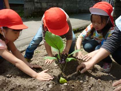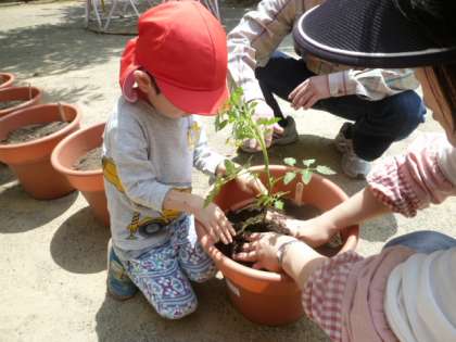 自分たちで育てたい野菜を話し合って、年長組はナス・キュウリ・トマトを遊戯室の南側の畑に植えました。年中組は、一人一鉢ミニトマトを園庭で育てることにしました。