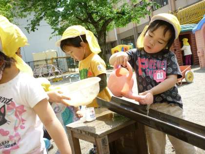 年少組は、雨樋に水を流して、川になっていく様子を喜んでいました。