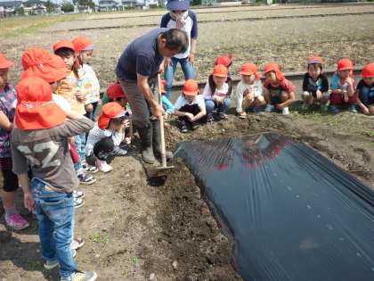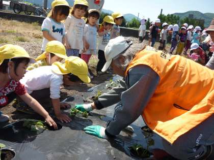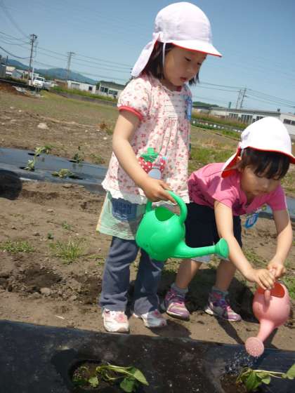 大沢野行政センター西側の畑をお借りしてサツマイモの苗を植えました。年長組、年中組の子供たちは、民生委員の里見さん・北野さん・加瀬さん・増田さんから、苗の植え方をていねいに教えてもらいながら、「こうすればいいが」と1本ずつ植えていきました。 子供たちは「大きなお芋ができますように」と、じょうろで水やりをして、秋の収穫を楽しみにしています。