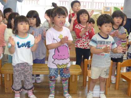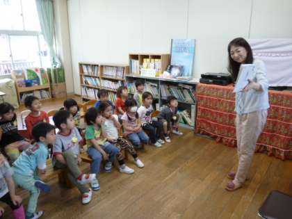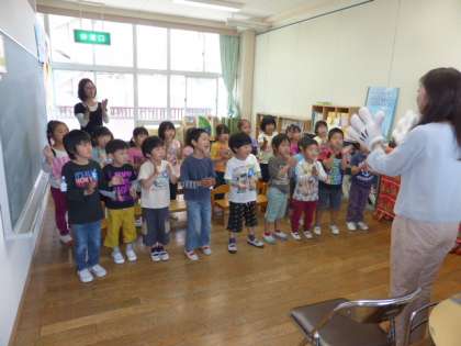 今日は、お話し会がありました。日ごろから親しんでいる絵本や季節の本を毎月、荒川先生に読んでいただきます。今回は、3歳児「ありこちゃんのおてつだい」「ぐりとぐらのえんそく」4歳児「きょうのおべんとうなんだろな」「にじいろのさかな」5歳児「くいしんぼううさぎ」「むしたちのおんがくかい」を読んでいただきました。絵本に合った音楽も流れ、子供たちの絵本へのイメージが膨らんだようです。