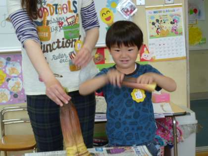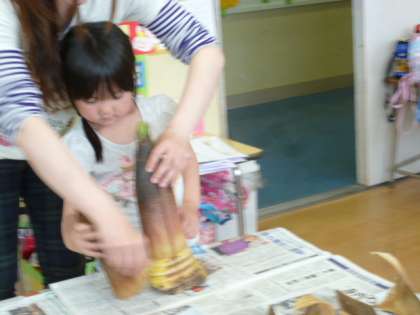 「たけのこの皮って何枚あると思う?」と聞くと子供達は、「僕は7枚だと思う!」「ちがよー、20枚だよ!」などと言いながら興味津津でした。