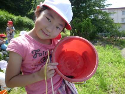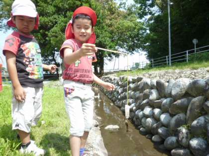 園の近くの用水へ、年中組と年長組がザリガニ釣りに行ってきました。割りばしの釣り竿にさきいかの餌をつけて、水面にそっとたらしてじっと待ちました。我慢できずに竿をすぐに動かしてしまうと、なかなか釣れません。「しーっ。静かにしないと(ザリガニ)にげちゃうよ」と、いう子や「あ、釣れたよ」と竿を持ち上げて見せる子、「なかなか釣れないなぁ」と場所を移動する子、みんな一生懸命に釣ろうとしていました。