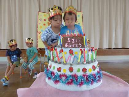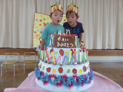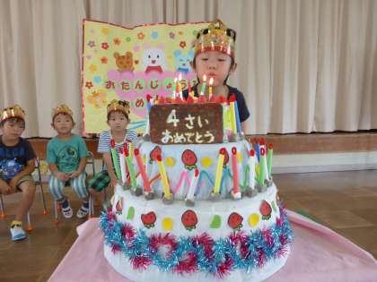 登園日2日目の今日は、8月生まれの誕生会をしました。日焼けした肌がたくましい8月生まれのお友達は、ローソクの火を消すのも勢いよく、皆にお祝いしてもらって笑顔いっぱいでした。また、お家の人からの心温まるお手紙にも嬉しさいっぱいで、照れて笑う姿がとても可愛らしかったです。